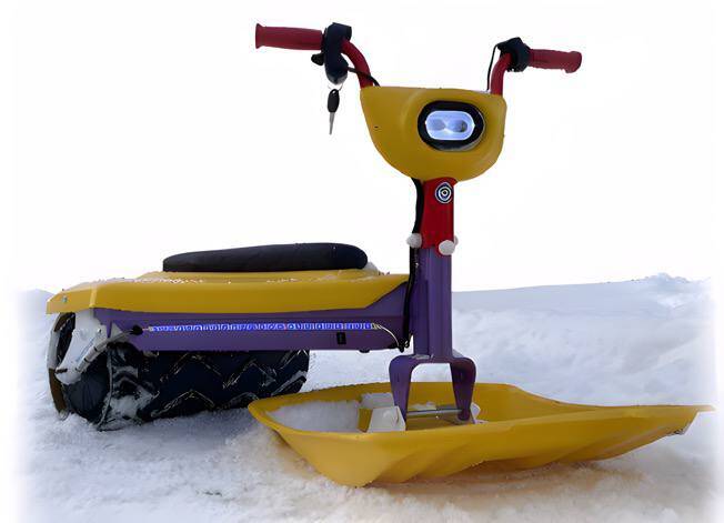 «КАШАЛОТ» надёжно сцепляется с поверхностью, поэтому выдержит даже взрослого человека. Складная конструкция рулевой колонки позволяет возить этот снегокат в багажнике авто.