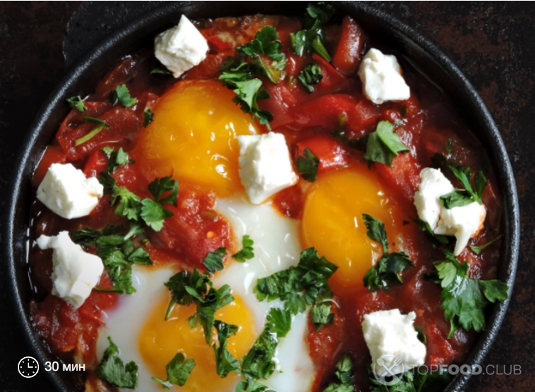 5. Завершающий штрих. Снимаю с огня. Раскрошила сверху фету, украсила петрушкой. Подала прямо в сковороде, горячей, ароматной, как лето в Тель-Авиве.