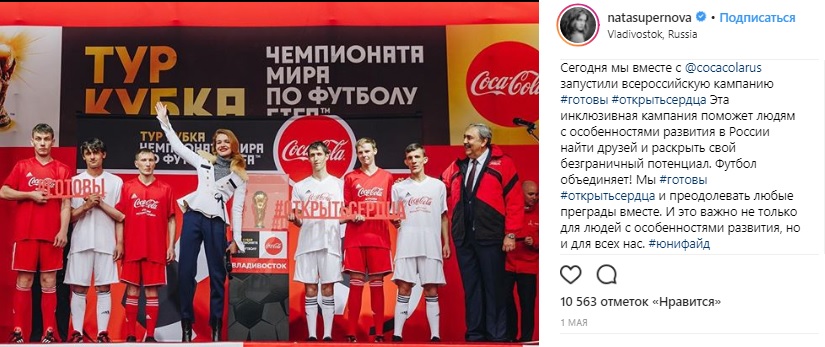 Накануне Наталья с cocacolarus запустили всероссийскую кампанию #готовы #открытьсердца. Как говорит сама звезда подиумов и создатель благотворительного фонда, эта инклюзивная кампания поможет людям с особенностями развития в России найти друзей и раскрыть свой безграничный потенциал. Футбол объединяет! Мы #готовы #открытьсердца и преодолевать любые преграды вместе. И это важно не только для людей с особенностями развития, но и для всех нас.