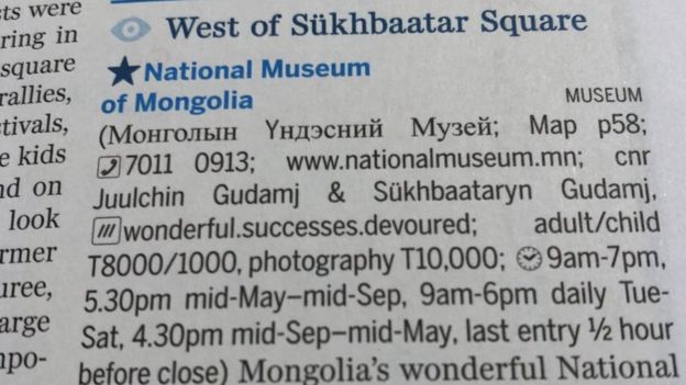 Путеводитель Lonely Planet подсказывает пользователям аппа, что найти Национальный музей в столице Монголии можно по координатам wonderful.success.devoured (чудесно.успех.поглощенный)