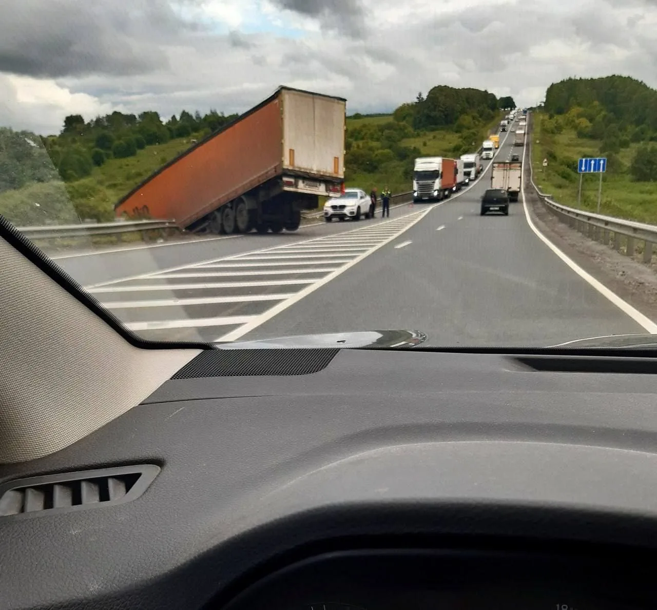 На фото заметно, что попавшая в ДТП фура перекрыла половину дороги. Следующие за ним автомобили не могут проехать, и на проезжей части скопилась длинная пробка из грузовиков и легковушек.