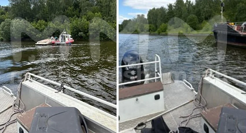Сообщение проиллюстрировано фотографиями, где запечатлен катер, из которого выпал ребенок. Также можно увидеть спасательное судно МЧС, с помощью которого ведутся поиски пропавшего мальчика.