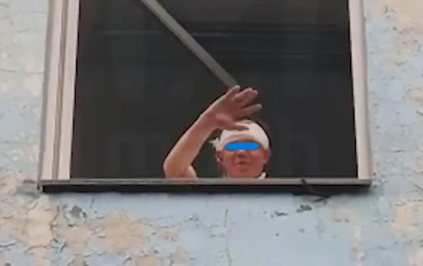 На видео запечатлен мальчик, выглядывающий в окно больничной палаты на третьем этаже четырехэтажного здания. Его голова забинтована. Несмотря на травмы, юноша улыбается и оживленно разговаривает с друзьями, которые стоят под окнами больницы и снимают его на видео.