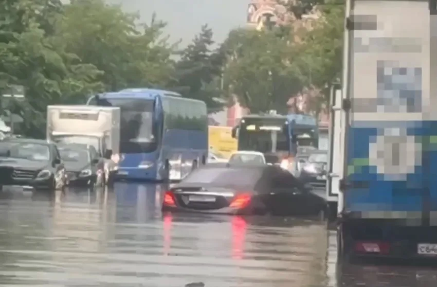 В Москве из-за сильного ливня затопило Филевский бульвар, в воде почти полностью утонул легковой автомобиль, на дороге образовалась пробка. Об уличном потопе сообщил Telegram-канал «Моя Москва».