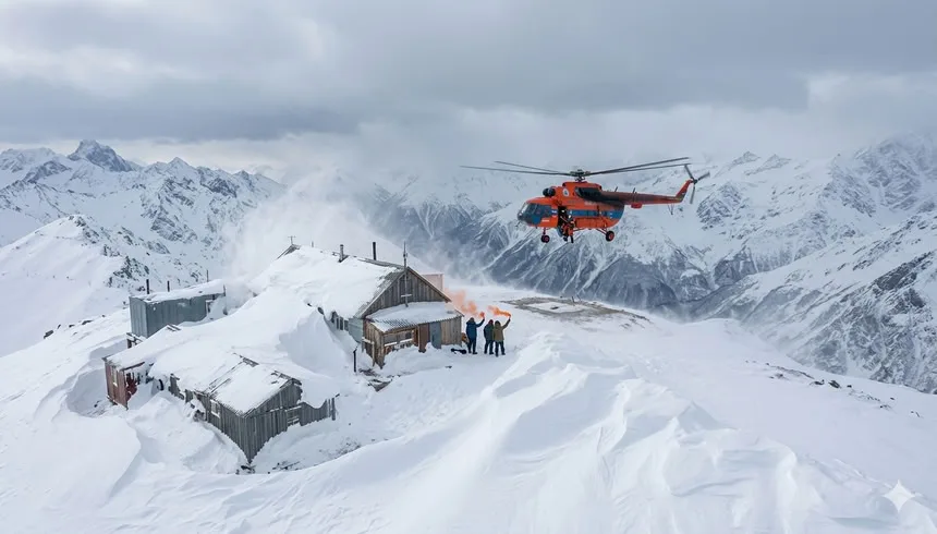 Спасательная операция продолжается уже более четырех часов, однако из-за сильного порывистого ветра и продолжающегося снегопада экипаж вертолета не может совершить безопасную посадку. Вертолет МЧС продолжает кружить над местом происшествия, чтобы поддерживать визуальный контакт с метеостанцией и убедиться в том, что все сотрудники живы.