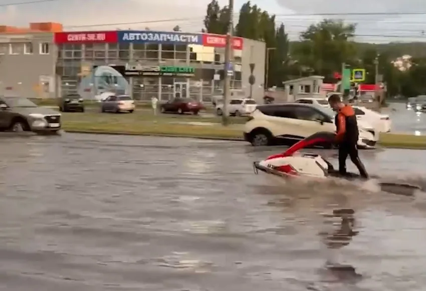 В Пензе после сильного ливня 15 июля мужчина прокатился на гидроцикле по затопленным улицам, вызвав зависть автомобилистов. Очевидцы сняли гидроциклиста на видео, кадры опубликовал Telegram-канал «Сапа».