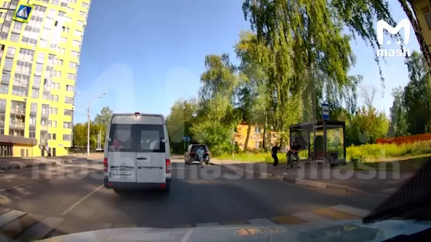 На кадрах запечатлено, как посреди дороги притормаживает кабриолет, из него выходит мужчина в белой кепке. Взглянув на происходящее издали, он снова садится в автомобиль. Затем на видео можно заметись автобус и потасовку нескольких мужчин возле него. В руках у молодых людей заметен нож и пистолет. К ним подъезжает кабриолет, и мужчины что-то эмоционально рассказывают водителю в белой кепке.