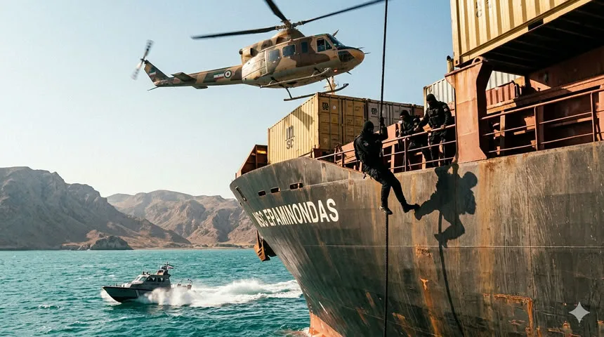 В сети появились кадры захвата контейнеровоза MSC Epaminondas под флагом Либерии в Ормузском проливе. На видео зафиксирован момент абордажа: быстроходные катера сближаются с судном, после чего вооруженные бойцы поднимаются на борт. Запись опубликована через TopWar.