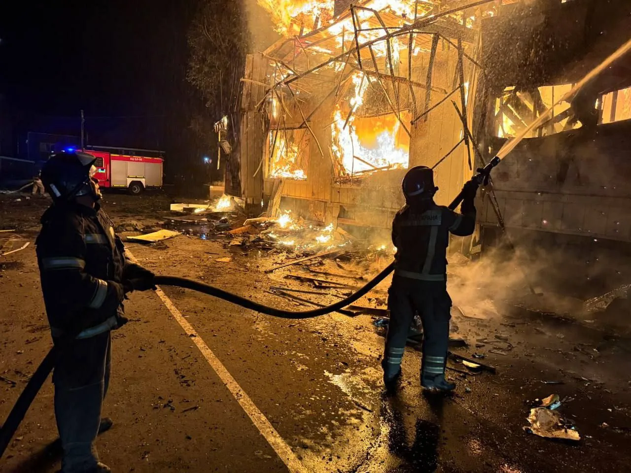 На снимках запечатлены торговые павильоны рынка «Сокол», объятые пламенем. Пожарные пытаются потушить возгорание, однако пока им это не удается. За происходящим наблюдают очевидцы из числа местных жителей.