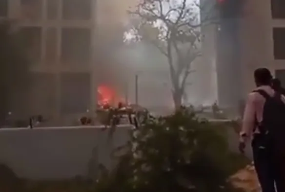Самолёт полностью разрушен — его части горят на земле, огонь перекинулся на деревья и близлежащие постройки. Пожарные продолжают тушить возгорания, спасатели выносят пострадавших на носилках.