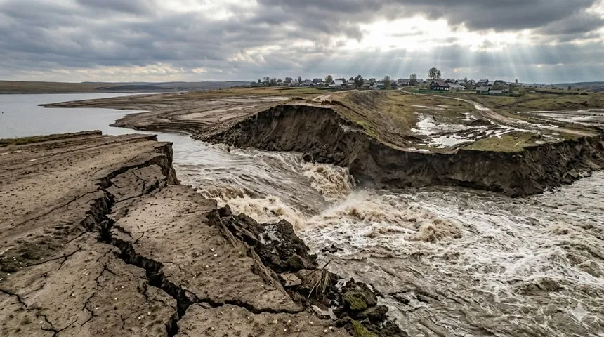 По словам местных жителей, вода стремительно покидает водоем, уровень которого упал настолько, что береговая линия отступила уже более чем на 20 метров. На месте прорыва образовалась глубокая промоина, достигающая трех метров в глубину.