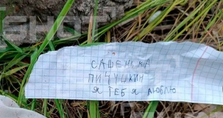 На снимке запечатлен обрывок страницы из школьной тетради в клетку, который лежит на траве. На бумажке печатными буквами написано «Сашенька Пичушкин, я тебя люблю». Послание нашли правоохранители в лесу недалеко от тела убитой семилетней девочки.