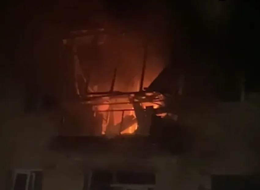 На видеозаписи запечатлен пожарный автомобиль, стоящий возле пятиэтажного жилого дома. На фасаде квартиры на первом этаже зияет огромная пробоина, окна практически нет, повреждена несущая стена. В квартире на втором этаже бушует пламя. Возле здания на земле лежит поврежденный БПЛА ВСУ.