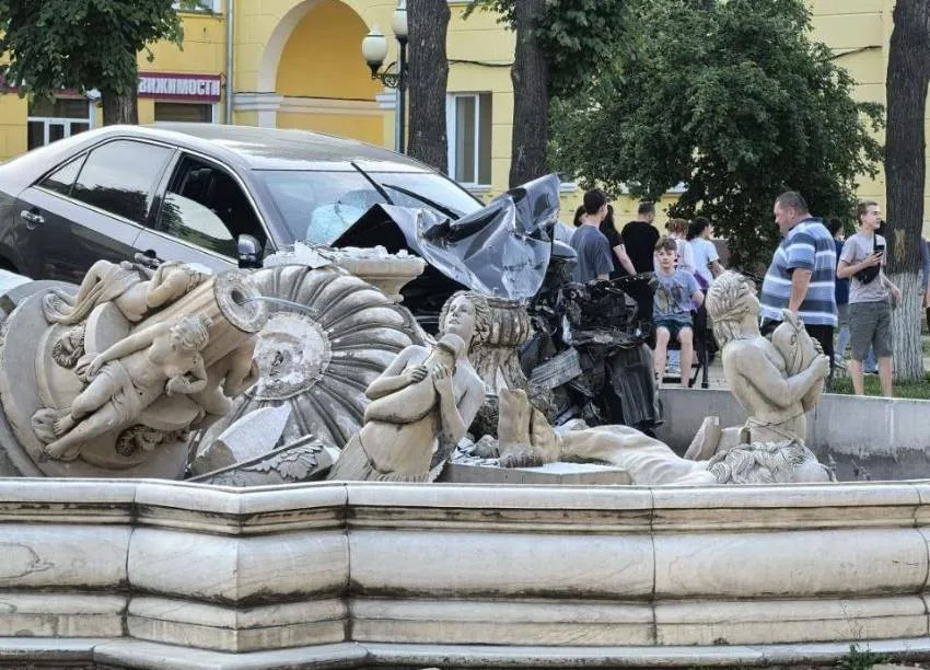 Фонтан сильно пострадал в результате наезда. У автомобиля разбита вся передняя часть. Рядом с местом ДТП стоят сотрудники скорой помощи, которые беседуют с водителем. Мужчина находится в шоковом состоянии. Мужской голос за кадром комментирует: «Мне кажется, трезвый».