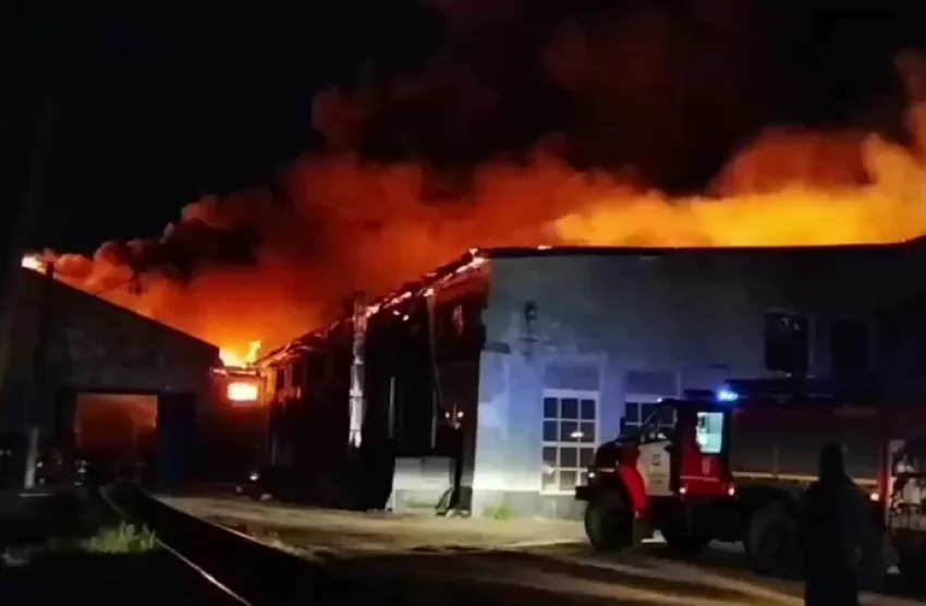 В городе Тайшет Иркутской области поздним вечером 30 мая загорелось локомотивное депо, огонь тушит пожарный поезд. Видеокадрами процесса тушения пожара поделились в пресс-службе МЧС России.
