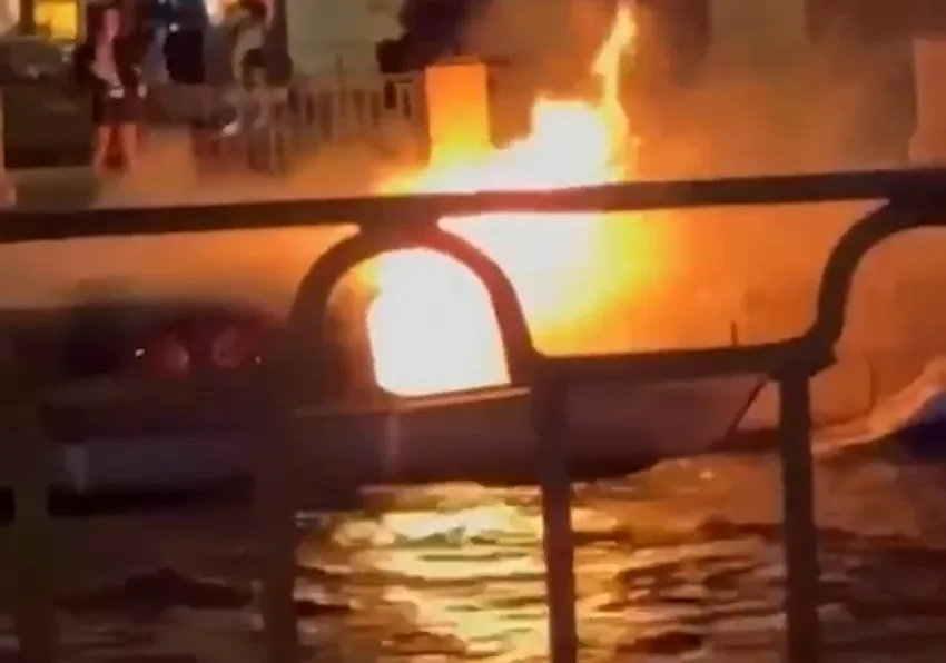 Пост проиллюстрирован видеозаписью, на которой запечатлен горящий катер. Огнеборцы тушат огонь, стоя на набережной.