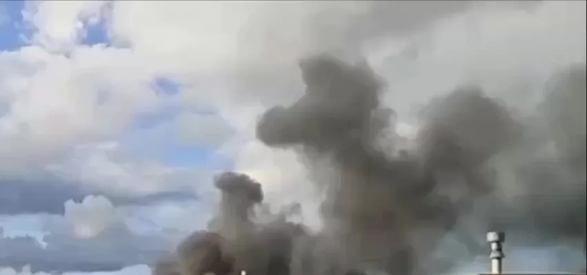 На кадрах запечатлен густой черный дым, поднимающийся над зданиями.