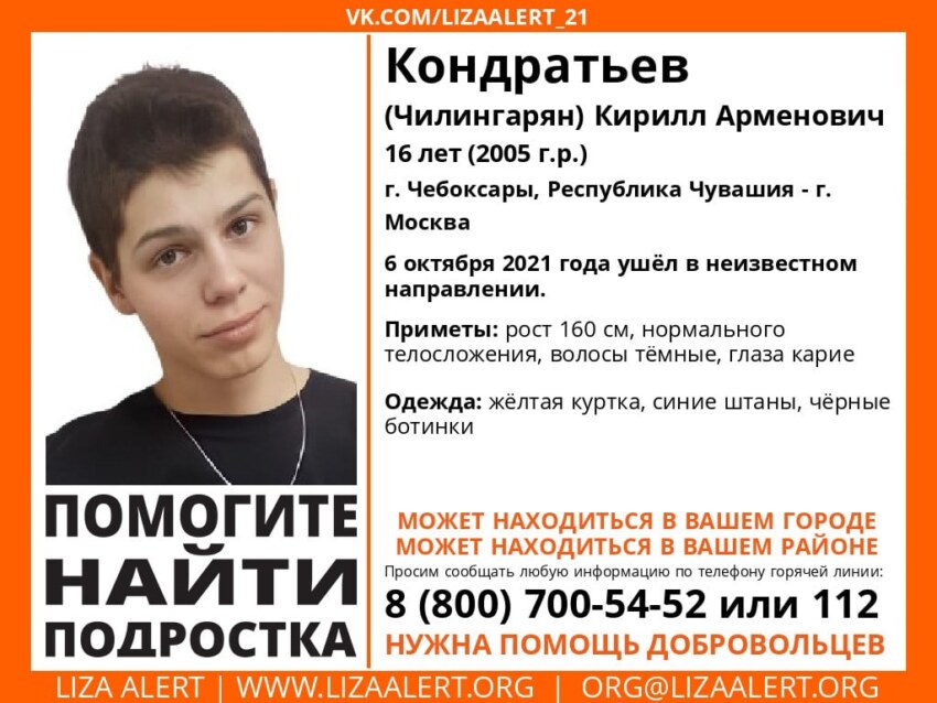Поисковики «Лизы Алерт» рассказывают о поисках 16-летнего Кирилла Арменовича Кондратьева из Чебоксар республики Чувашии.
