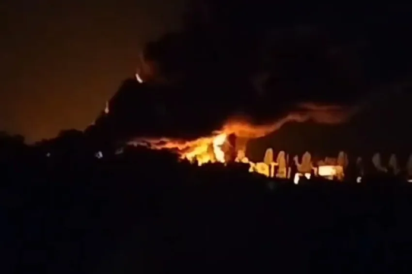 На видеозаписи запечатлен огромный пожар, бушующий в ночи на месте попадания беспилотников по своим целям. Слышен звук множественных мелких взрывов. В воздухе нарастает гул приближающего следующего «Герань-2». Когда дрон поражает цель, возникает мощный взрыв. Затем пожар разгорается еще сильнее.