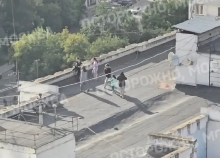 Публикация проиллюстрирована видеозаписью, которую сняли жители соседнего здания. На кадрах можно увидеть пять подростков с девочкой дошкольного возраста, которые находятся на крыше многоэтажки.