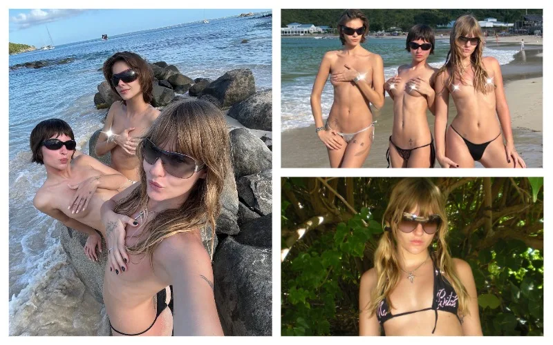 На снимках Виктория позирует с двумя подругами топлес, а обнаженную грудь девушки прикрывают руками. Для фотосессии они выбрали минималистичный стиль — на них были только трусы от бикини и солнцезащитные очки.