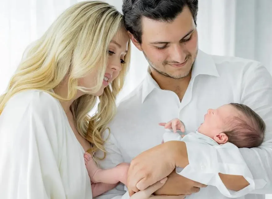 На другом фото она склонилась над своим мужем Майклом Булосом, и они оба с любовью смотрят на своего ребёнка.