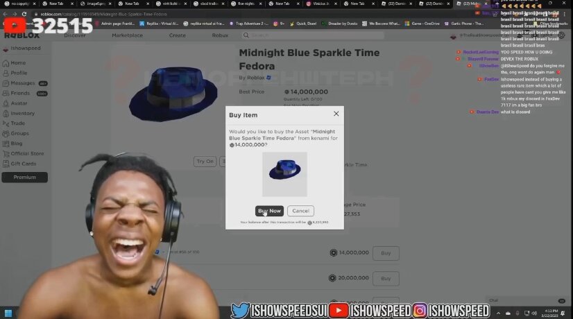 Известный стример IShowSpeed случайно купил шляпу в игре Roblox за огромную сумму в ₽10 млн. По словам Speed’а, он получил ссылку на этот предмет от одного из своих зрителей. Он зашел на страницу и увидел огромную цену на шляпу, но решил пошутить и нажать на кнопку покупки с закрытыми глазами. Таким образом, Speed случайно потратил огромную сумму на шляпу в игре.