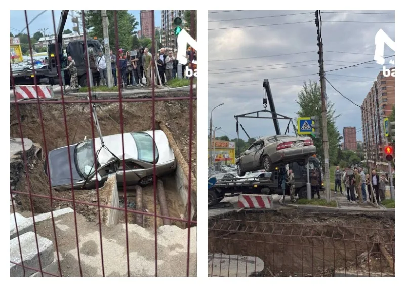 В Иркутске водитель легковушки протаранил дорожное ограждение и рухнул в раскопанную яму на перекрёстке Лермонтова и Чернышевского, где ведётся ремонт теплотрассы.
