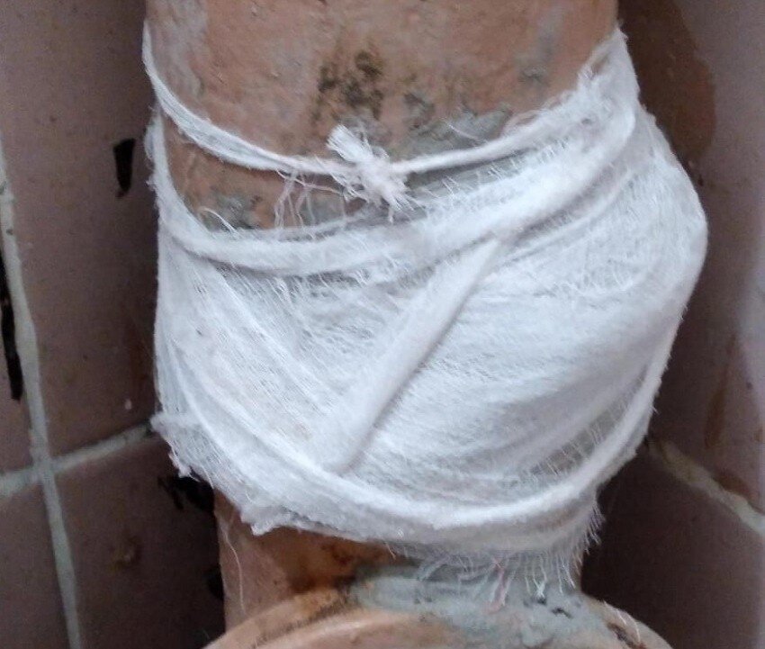 Чугунную трубу канализации в жилом доме в Сарове отремонтировали при помощи бинтов. Владелец квартиры утверждает, что вызвал слесарей уже в восьмой раз. Фото ремонта опубликовано в социальной сети.