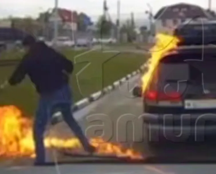 По словам очевидцев, один из водителей, явно заскучав в ожидании, решил «развлечься» и поднёс зажигалку прямо к бензобаку автомобиля. Об этом пишет тг-канал Amur Mash.