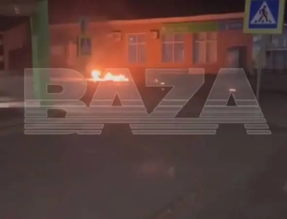 На видео, снятом в городе Ельня, виден небольшой пожар на проезжей части, вызванный упавшим беспилотником.