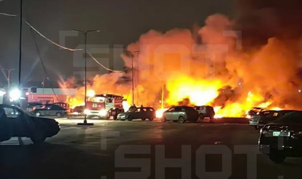 В результате атаки беспилотников на парковку компании «Мираторг» в Домодедово полностью сгорели более 20 автомобилей. Огонь охватил территорию стоянки после попадания БПЛА, а сильный взрыв разрушил несколько машин.
