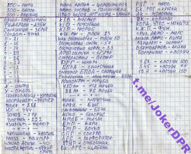 Себя в условных обозначениях вагнеровцы называют «строителями», солдат – «утками», а артобстрел «грязью». В самом верху бумаги с записями обозначено, что «200» обозначает пыль, «300» песок, а «500» плесень. Судя по военному сленгу, таким образом бойцы сообщали о потерях убитыми, ранеными и сбежавшими с поля боя.