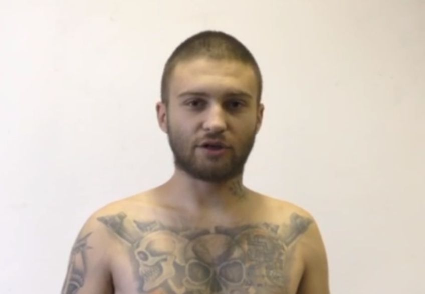 Пленный украинец появляется на видео с голым торсом, на котором хороши видны многочисленные татуировки националистического содержания.