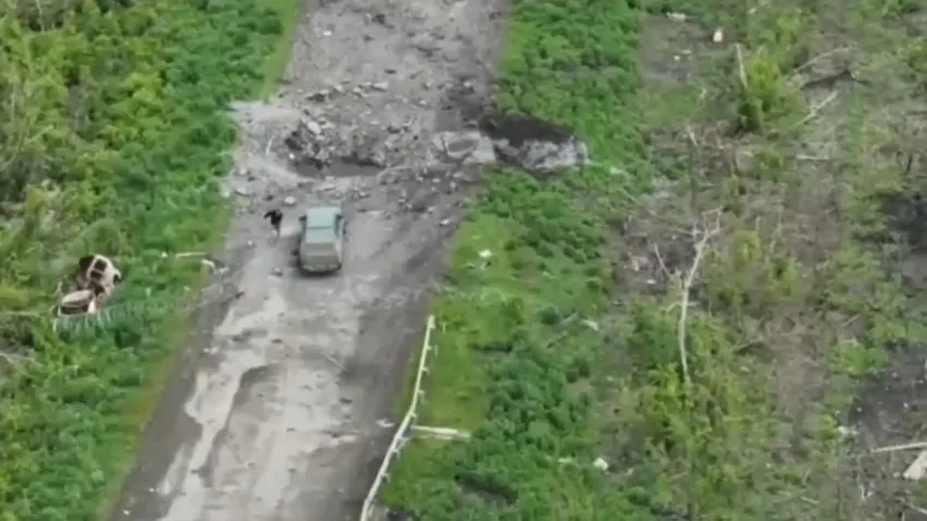 На видеозаписи запечатлен грузовик, едущий по дороге. Российский FPV-дрон уничтожает его точным ударом. После этого в кадре появляется украинский блиндаж. Российские бойцы уничтожают его из гранатомета.