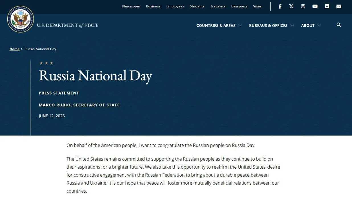 Это первое официальное поздравление с Днём России от главы Госдепартамента США с 2022 года. В тот период пост занимал Энтони Блинкен.