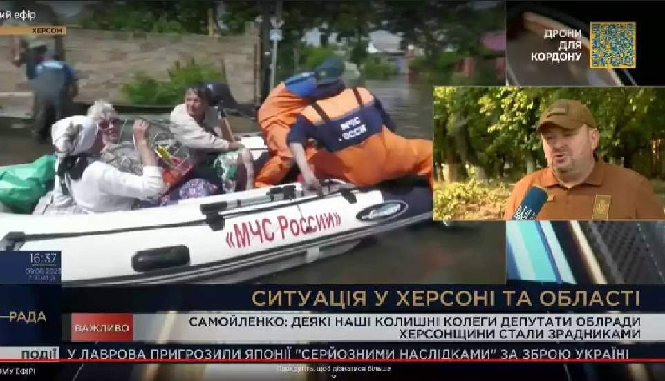 В пятницу, 9 июня в эфире телемарафона на украинском канале «Рада» около 16:35 появились кадры, на которых отчетливо виднеются лодки с символикой российских спасателей. Представители МЧС РФ проводили эвакуацию людей в левобережной части Херсонской области.