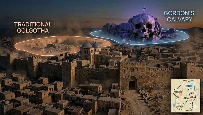 Альтернативная теория, получившая поддержку в середине XIX века, предлагает место на холме к северу от Иерусалима, недалеко от Дамасских ворот. Немецкий теолог Отто Тениус и британский генерал-майор Чарльз Гордон указывали, что скалистый хребет напоминает человеческий череп.
