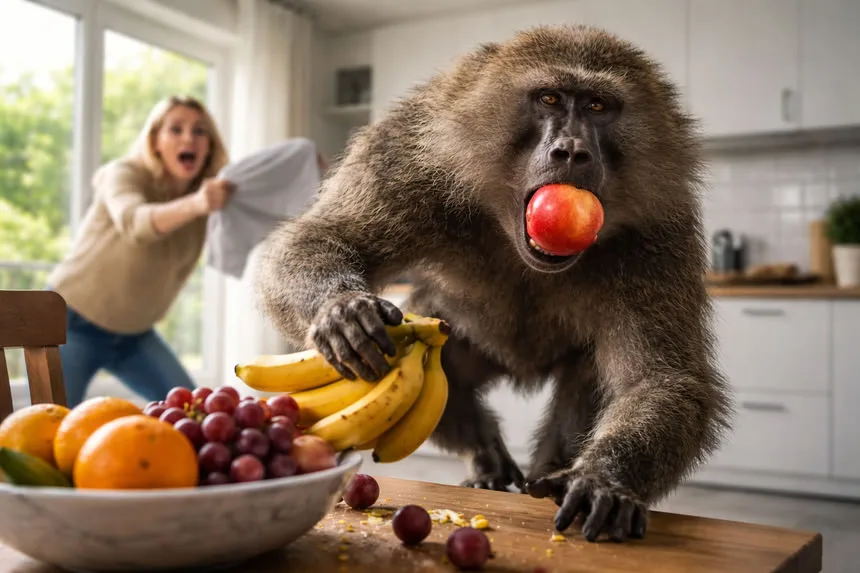 Огромный бабуин спровоцировал переполох, проникнув в частное домовладение ради кражи запасов продовольствия. Животное целенаправленно пробралось на кухню, где в открытом доступе находились свежие фрукты. Видеозапись инцидента, демонстрирующая дерзкое поведение примата, опубликована в Telegram-канале «Пока в тренде».