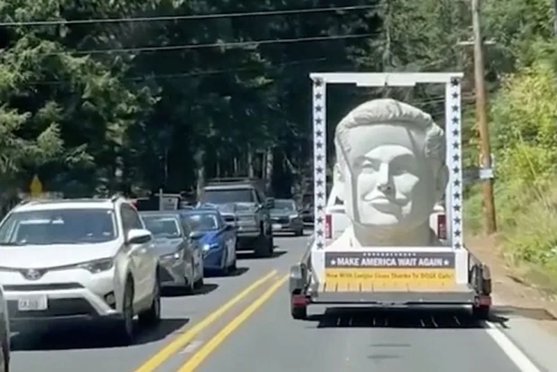На ухмыляющуюся голову Илона Маска, высотой 3,7 метра, нанесена надпись «Заставьте Америку снова ждать», также она украшена патриотическими звездами.
