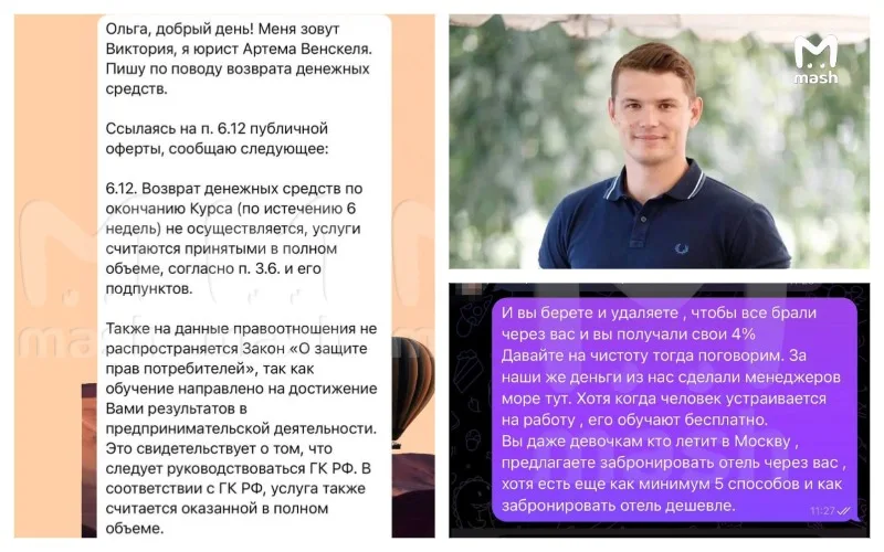 Адвокат Андрей Сергеев, представляющий интересы пострадавших, заявил, что каждая из них заплатила по 125 тысяч рублей за обучение, ожидая раскрытия профессиональных секретов. Однако после оплаты они обнаружили, что учебные чаты практически мертвы, а сам коуч был занят не наставничеством, а публикацией сторис с курортов. Когда девушки потребовали возврата средств, получили отказ. Об этом пишет тг-канал Mash.
