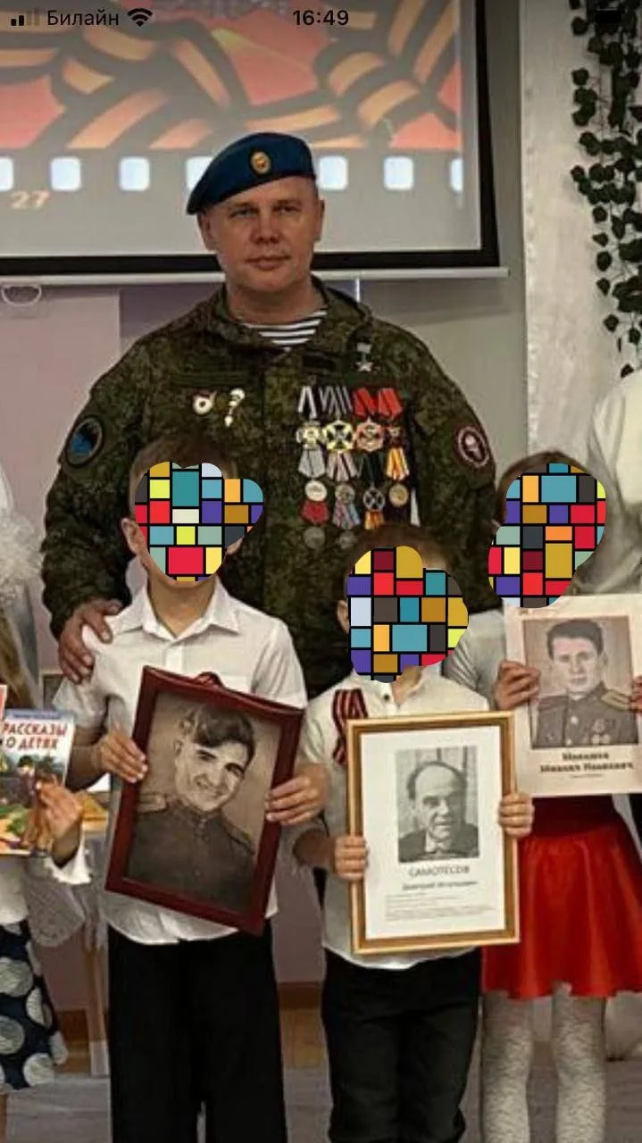Мужчина в военной форме с вручаемой посмертно медалью ЧВК «Вагнер» прибыл в российскую школу для участия в мероприятиях, организованных специально для ветеранов.