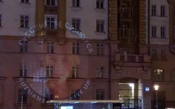 На здание американского посольства в Москве в годовщину освобождения россиянки Марии Бутиной из тюрьмы в США спроецировали ее портрет и фразу «Русские не сдаются» с переводом на английский.