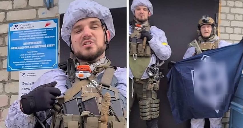 Два мужчины в видеоролике стоят возле фельдшерско-акушерского пункта в Климовском районе Брянской области, слева для зрителей — командир отряда РДК, неонацист Денис Капустин, которого широко знают под псевдонимом Денис Никитин.