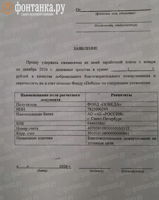 Заявление было оформлено на имя главного врача, там есть просьба ежемесячно в течение 2026 года (с января по декабрь) переводить часть зарплаты в один из фондов как благотворительное пожертвование на уставные цели. Сумму пожертвования можно написать самим.