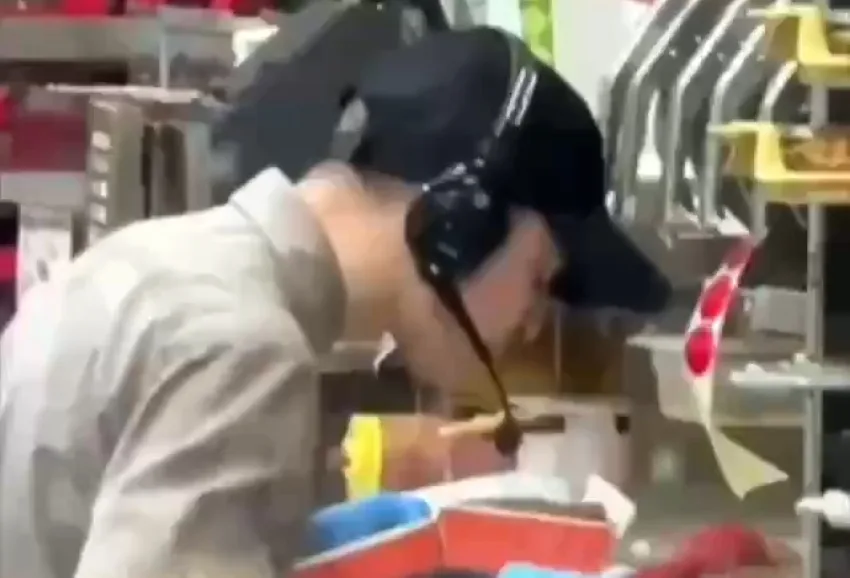 Публикация проиллюстрирована видеозаписью. На ней можно увидеть юношу в наушниках и кепке, который укладывает бургеры в упаковку. Оглянувшись по сторонам, парень плюет в кушанье.