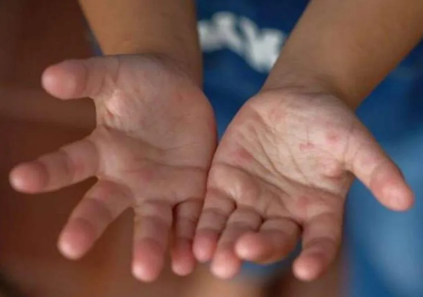 Через несколько дней на ладонях и стопах девочки проявились зудящие пятна. Через неделю появились насморк, кашель, сыпь сильно потемнела, и кожа начала слезать с пяток и пальцев. Температура все это время оставалась высокой.