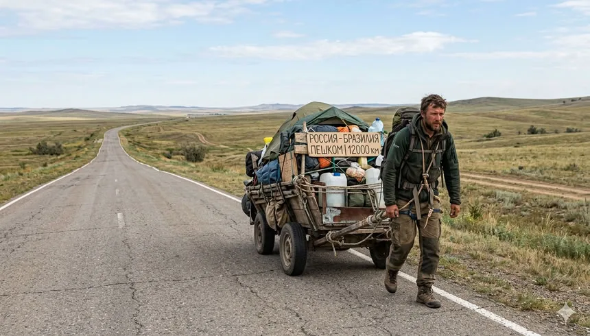 Житель Ставрополя Александр, получивший прозвище Саша Конь, начал пеший переход в Бразилию с самодельной 300-килограммовой повозкой. Путешественник тянет конструкцию за собой на тросе, преодолевая ежедневно от 15 до 30 километров. Об инцидентах на дорогах и деталях маршрута сообщает Telegram-канал Mash.