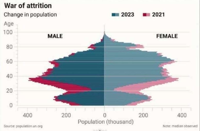 Данные Организации Объединенных Наций свидетельствуют, что в 2021 году юношей двадцати лет насчитывалось на Украине около 200 тысяч человек, то на сегодняшний день их всего 70 тысяч. Столь же удручающая цифра и по девушкам. В 2021 году их количество так же составляло примерно 200 тысяч, а сократилось до 50 тысяч.