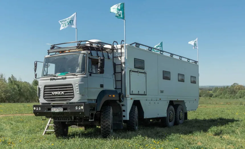 Компания «Волгатрейд» представила проект автодома, выполненного на базе грузового шасси «Урал 9593» с колесной формулой 8×8. Разработка позиционируется как мобильный гостиничный комплекс, рассчитанный на размещение до 12 человек.